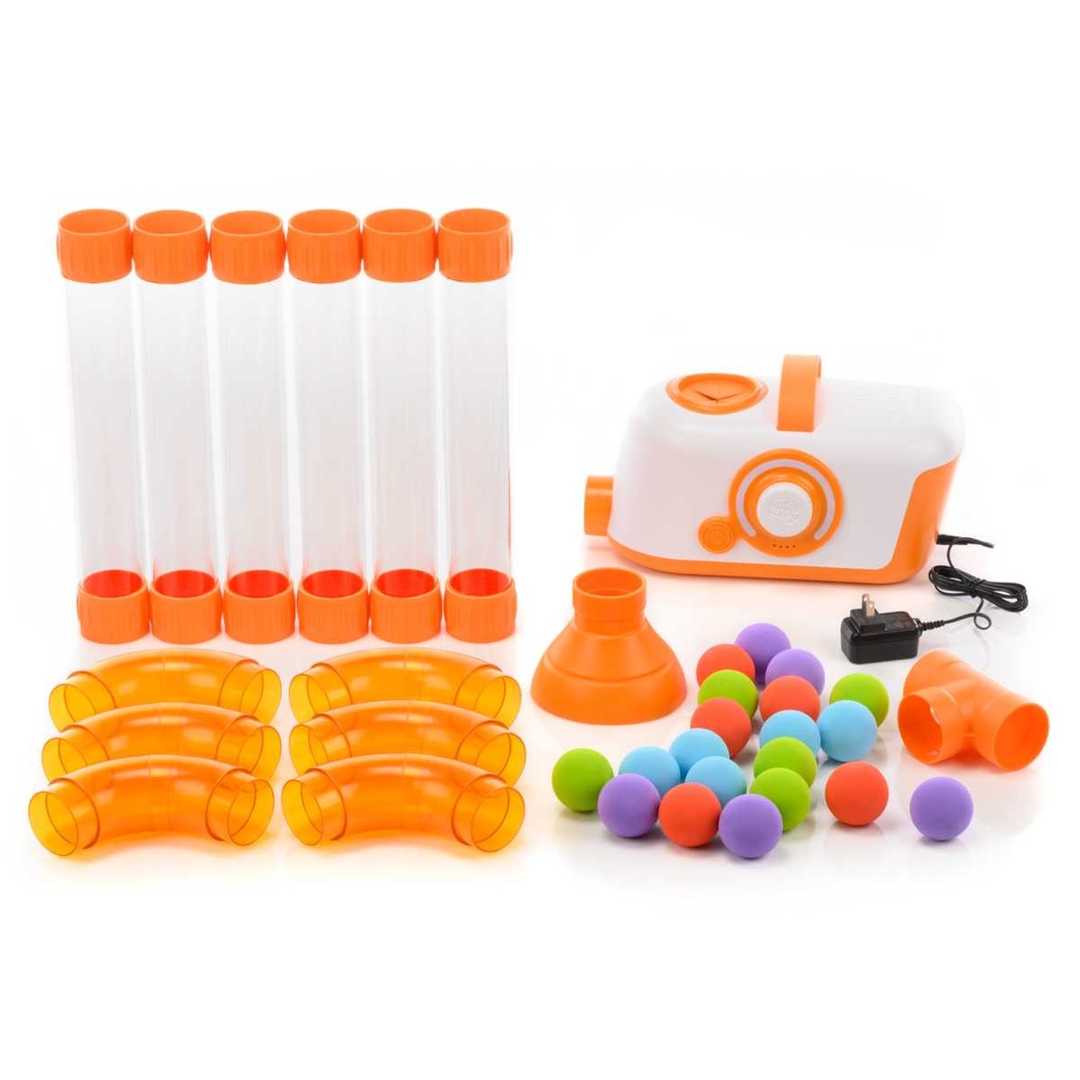 Arrange the tubes and connectors in any way you can imagine. Create loops and swirls. Weave them under tables and over desks. Then, switch on the turbine and let the experimentation begin. . . Can you make the foam balls leap from one tube to the next, or hover in mid-air, or go around and around in an endless cycle? What happens when you load the tubes with all the balls, then turn it all the way up?
