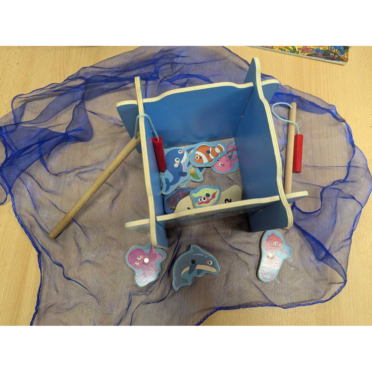 - Wooden fishing game (4 interlocking sides, blue sensory scarf 'sea', 2 rods, 14 magnetic fish